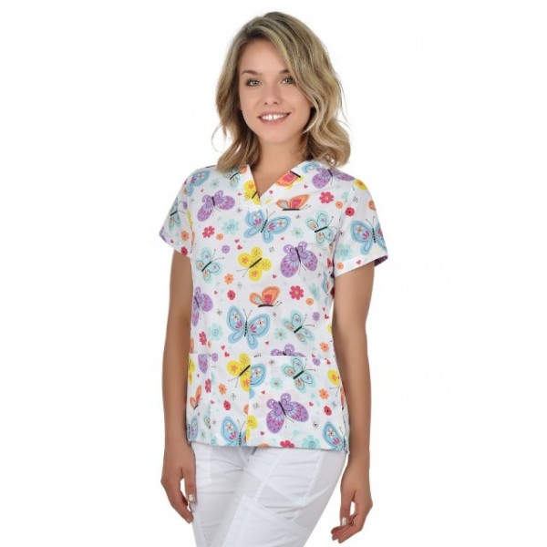 Lastnosti: Ženska tunika, potiskana z živahnim vzorcem pisanih metuljev. Tunika ima v-izrez, kratke rokave in dva žepa. Tunika ni raztegljiva.
